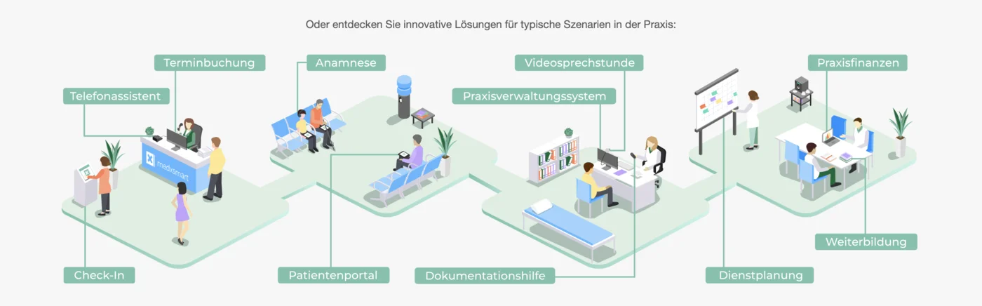 medxsmart fungiert als zentrale Anlaufstelle, auf der Arztpraxen, psychotherapeutische Praxen, Kassenärztliche Vereinigungen, Psychotherapeutenkammern, Verbände und weitere Interessenten sich über verfügbare digitale Lösungen informieren können. Die Plattform deckt nahezu jeden Arbeitsschritt in der digitalen Praxis ab und bietet Produktübersichten in folgenden Kategorien: